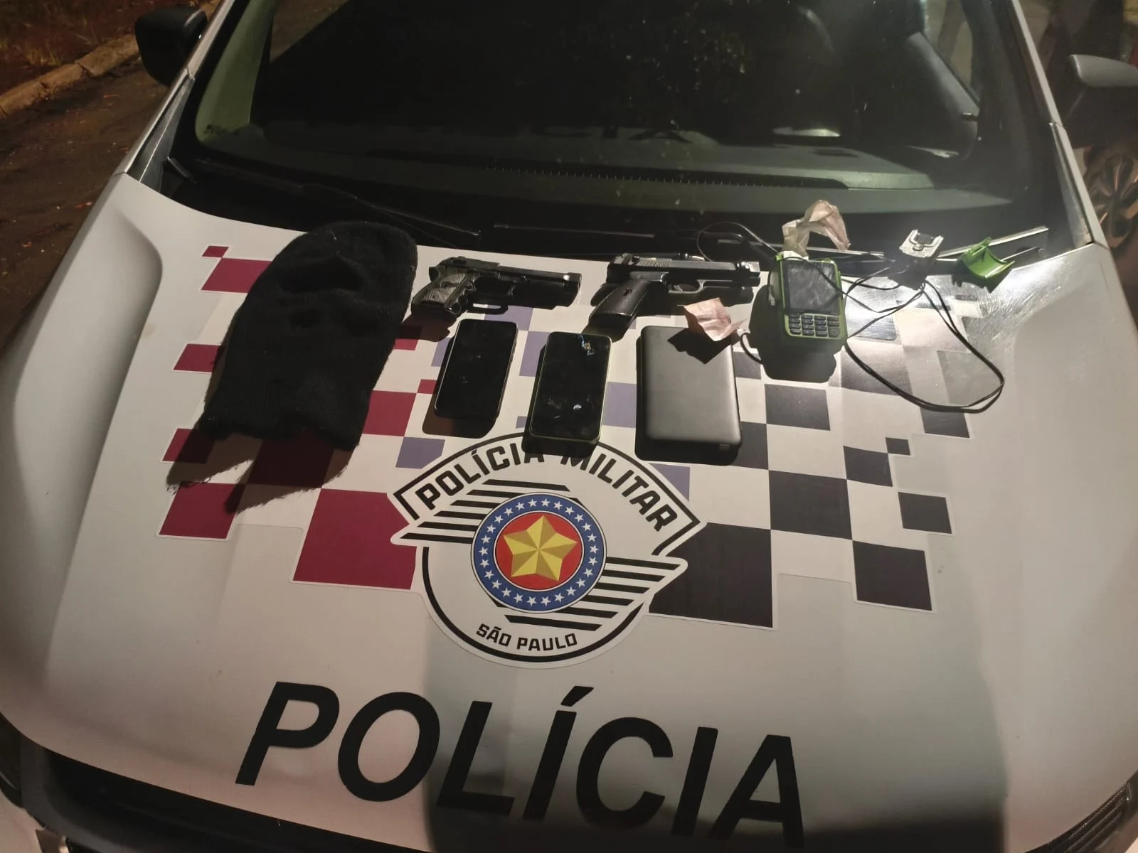 Durante a vistoria no veículo, foram localizados dois simulacros de arma de fogo tipo pistola, uma touca balaclava, aparelhos celulares, um tablet, uma máquina de cartão, dinheiro em espécie e um invólucro contendo substância análoga ao crack.